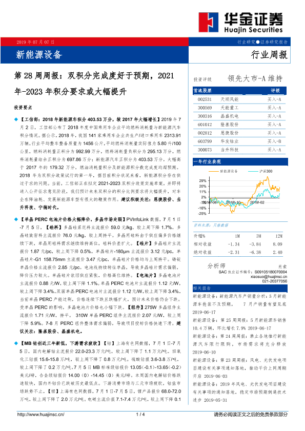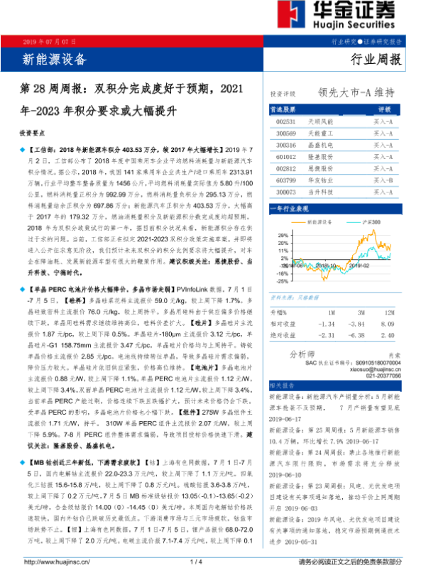 【华金证券】【20190707】新能源设备第28周周报:双积分完成度好于预期,2021年-2023年积分要求或大幅提升-4页