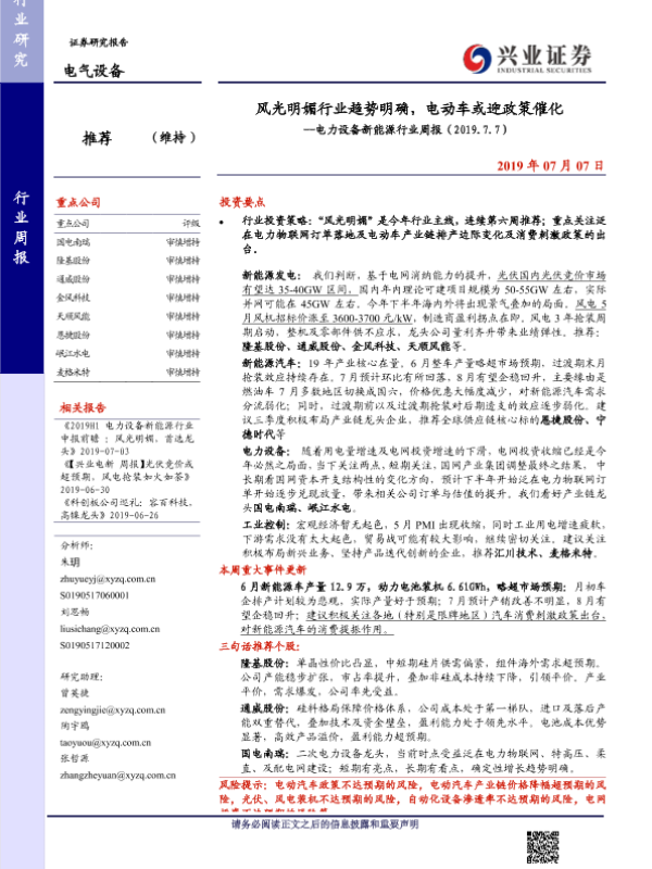【兴业证券】【20190707】风光明媚行业趋势明确,电动车或迎政策催化--电力设备新能源行业周报(2019.7.7)-32页