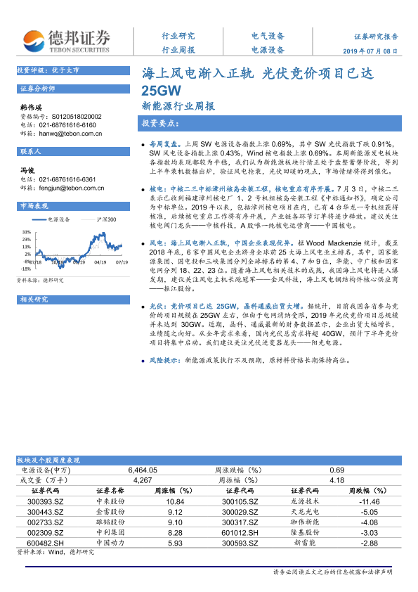 【德邦证券】【20190708】20190708-德邦证券-新能源行业周报:海上风电渐入正轨 光伏竞价项目已达25GW-11页