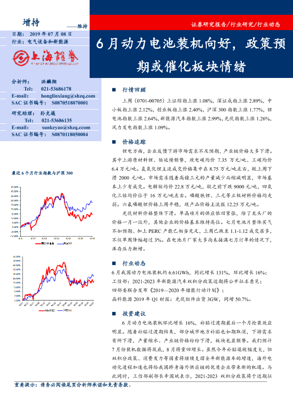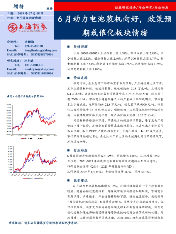 【上海证券】【20190708】电气设备和新能源:6月动力电池装机向好,政策预期或催化板块情绪-14页