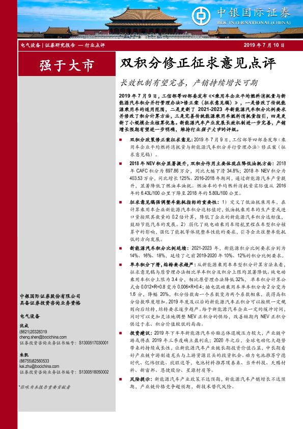 【中银证券】【20190710】电气设备行业双积分修正征求意见点评:长效机制有望完善,产销持续增长可期-10页