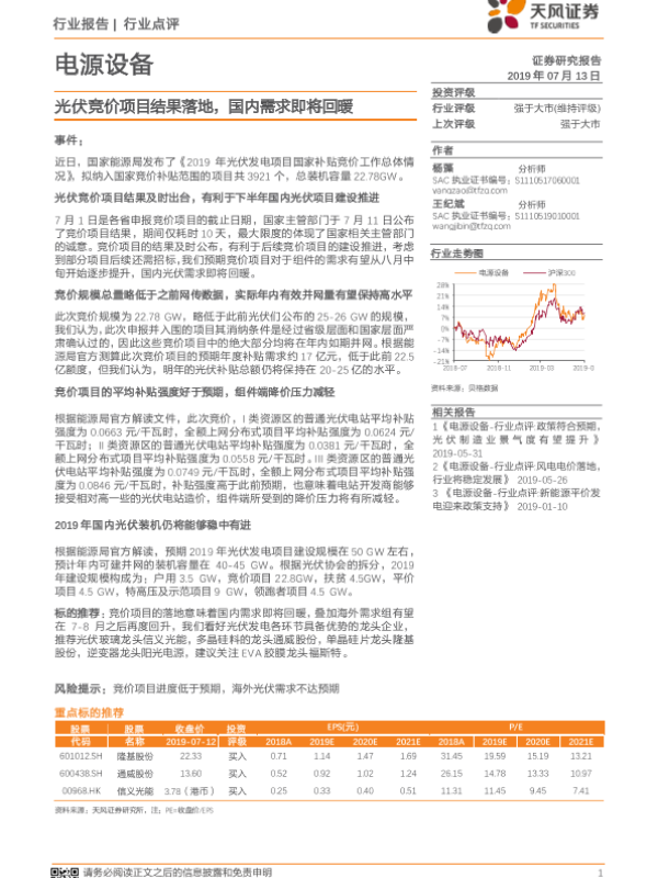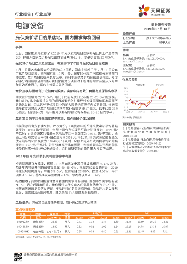 【天风证券】【20190713】电源设备行业点评:光伏竞价项目结果落地,国内需求即将回暖-3页
