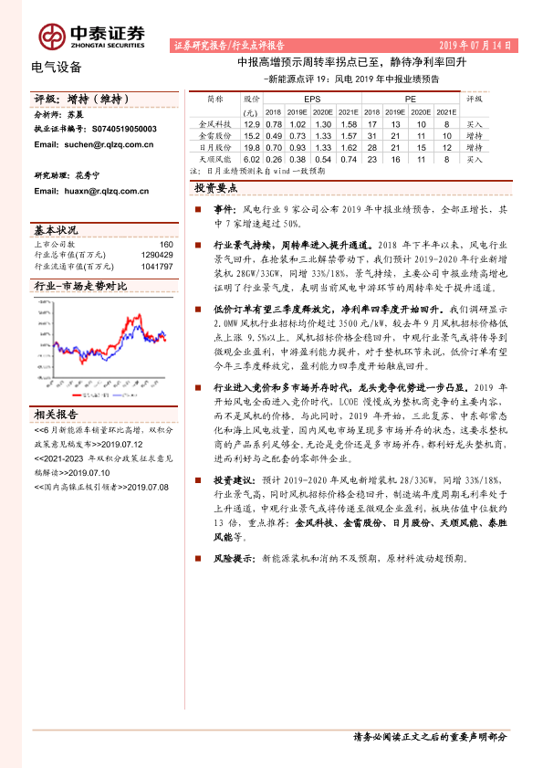 【中泰证券】【20190714】新能源点评19:风电2019年中报业绩预告-中报高增预示周转率拐点已至,静待净利率回升-3页