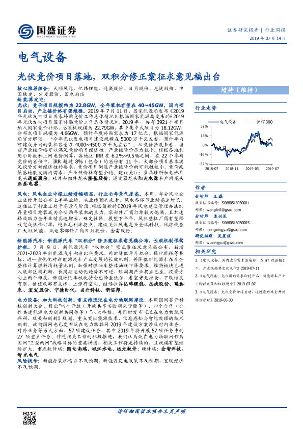 【国盛证券】【20190714】20190714-国盛证券-电气设备行业周报:光伏竞价项目落地,双积分修正案征求意见稿出台-24页