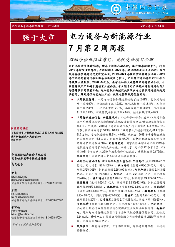 【中银证券】【20190714】电力设备与新能源行业7月第2周周报:双积分修正征求意见,光伏竞价项目公布-17页