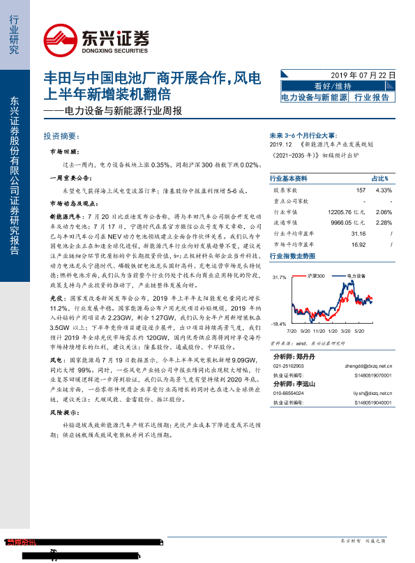 【东兴证券】【20190722】电力设备与新能源行业周报:丰田与中国电池厂商开展合作,风电上半年新增装机翻倍-13页