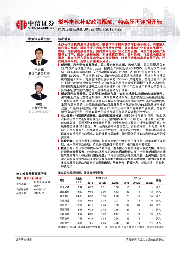 【中信证券】【20190722】电力设备及新能源行业周报:燃料电池补贴政策酝酿,特高压再迎招开标-13页