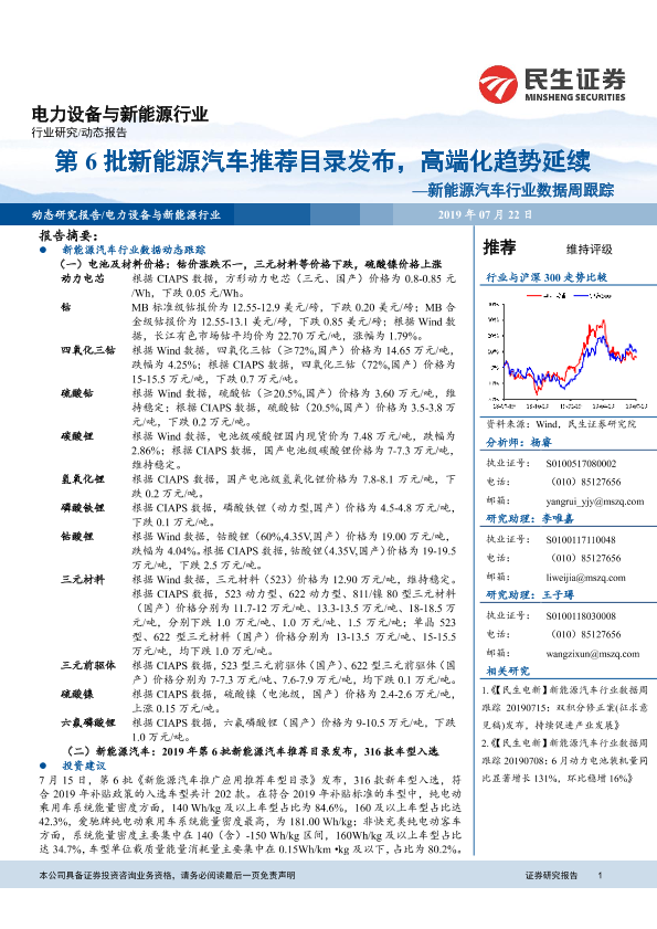 【民生证券】【20190722】20190722-民生证券-新能源汽车行业数据周跟踪:第6批新能源汽车推荐目录发布,高端化趋势延续-14页