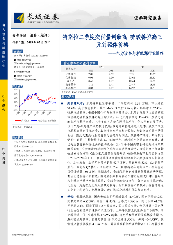 【长城证券】【20190728】电力设备与新能源行业周报:特斯拉二季度交付量创新高 硫酸镍推高三元前驱体价格-16页