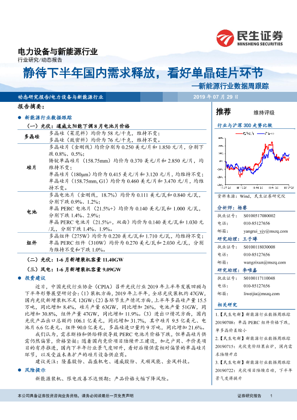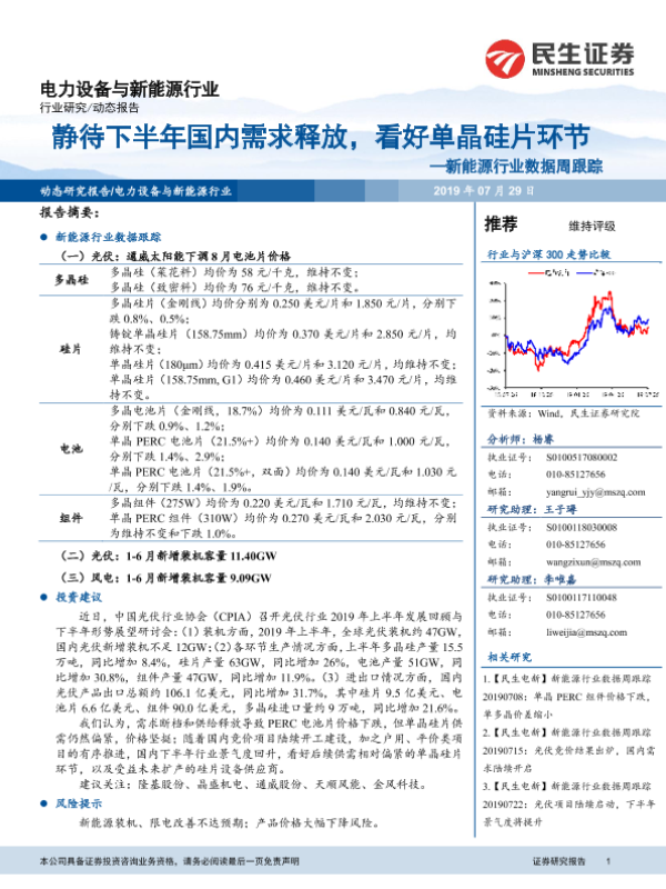 【民生证券】【20190729】20190729-民生证券-新能源行业数据周跟踪:静待下半年国内需求释放,看好单晶硅片环节-9页