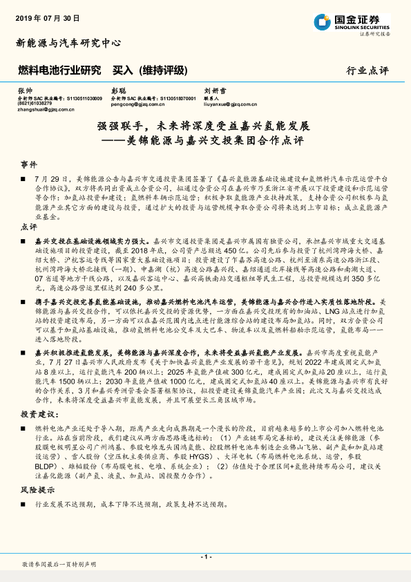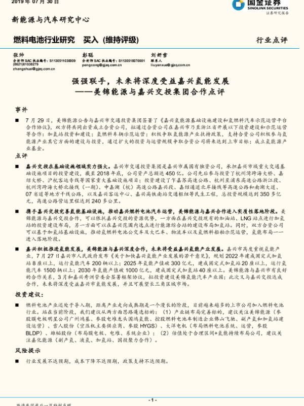 【国金证券】【20190730】美锦能源与嘉兴交投集团合作点评-强强联手,未来将深度受益嘉兴氢能发展-3页