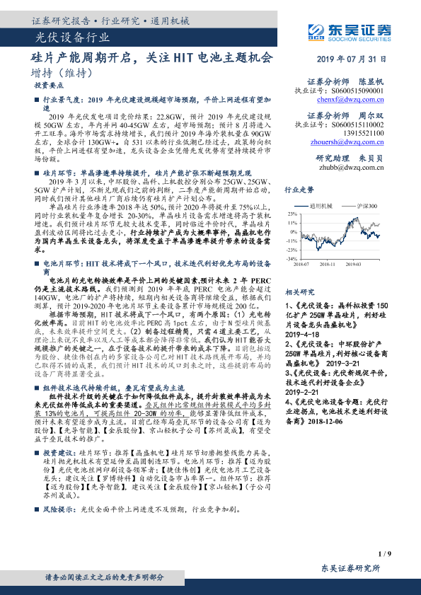 【东吴证券】【20190731】光伏设备行业:硅片产能周期开启,关注HIT电池主题机会-9页