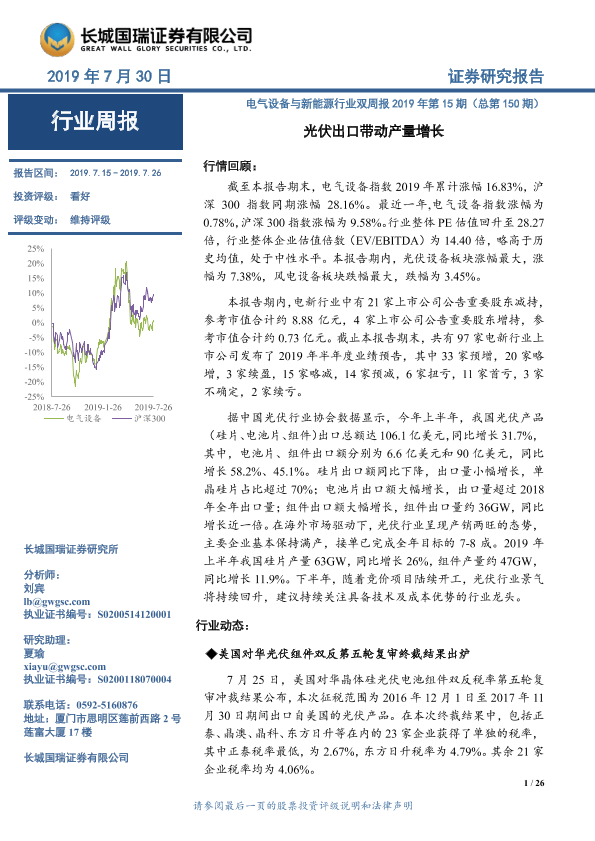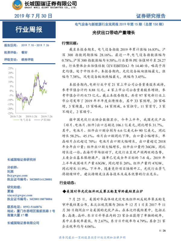 【长城国瑞证券】【20190730】电气设备与新能源行业双周报2019年第15期(总第150期):光伏出口带动产量增长-26页