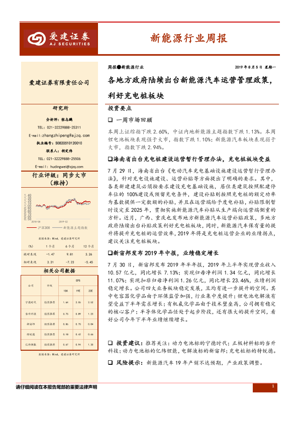 【爱建证券】【20190805】新能源行业周报:各地方政府陆续出台新能源汽车运营管理政策,利好充电桩板块-14页