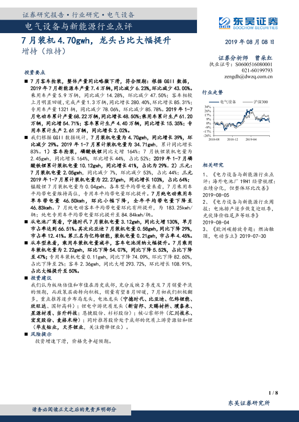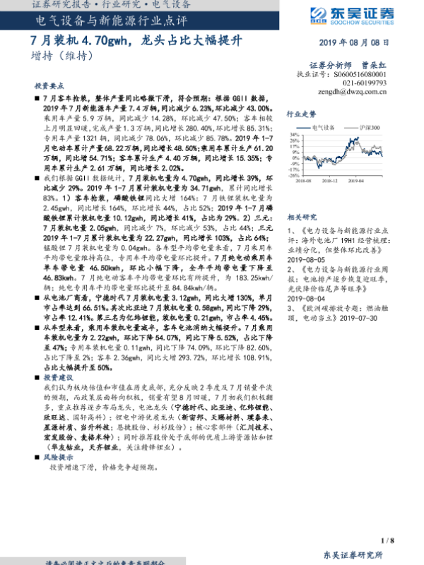 【东吴证券】【20190808】电气设备与新能源行业点评:7月装机4.70gwh,龙头占比大幅提升-8页