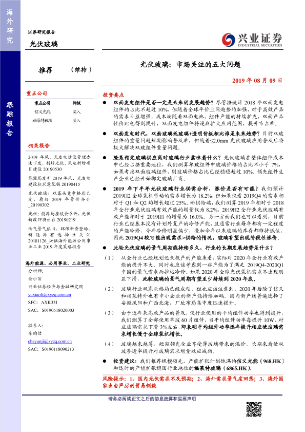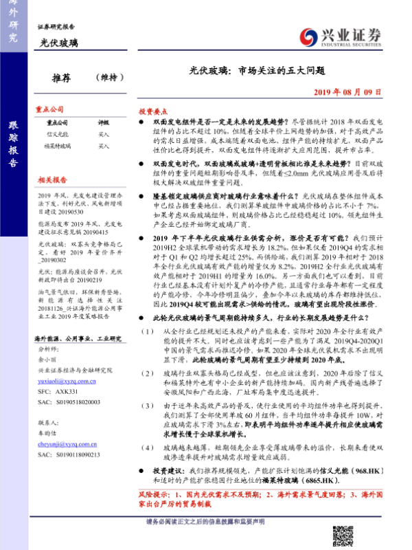【兴业证券】【20190809】光伏玻璃:市场关注的五大问题-28页