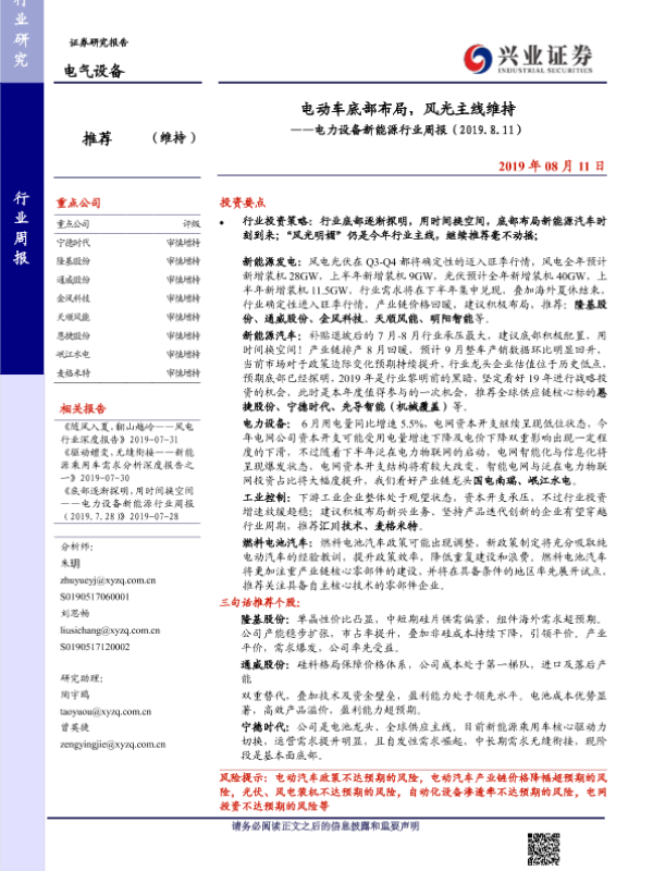 【兴业证券】【20190811】电动车底部布局,风光主线维持——电力设备新能源行业周报(2019.8.11)-29页
