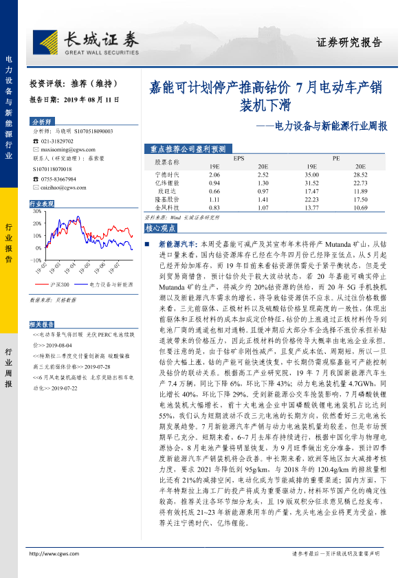 【长城证券】【20190811】20190811-长城证券-电力设备与新能源行业周报:嘉能可计划停产推高钴价 7月电动车产销装机下滑-16页