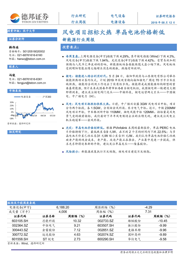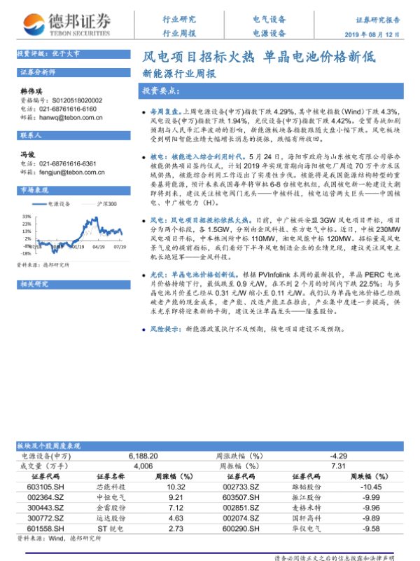 【德邦证券】【20190812】20190812-德邦证券-新能源行业周报:风电项目招标火热 单晶电池价格新低-11页