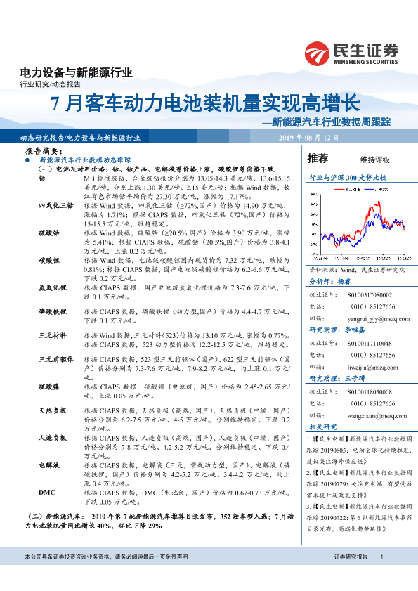 【民生证券】【20190812】20190812-民生证券-新能源汽车行业数据周跟踪:7月客车动力电池装机量实现高增长-15页