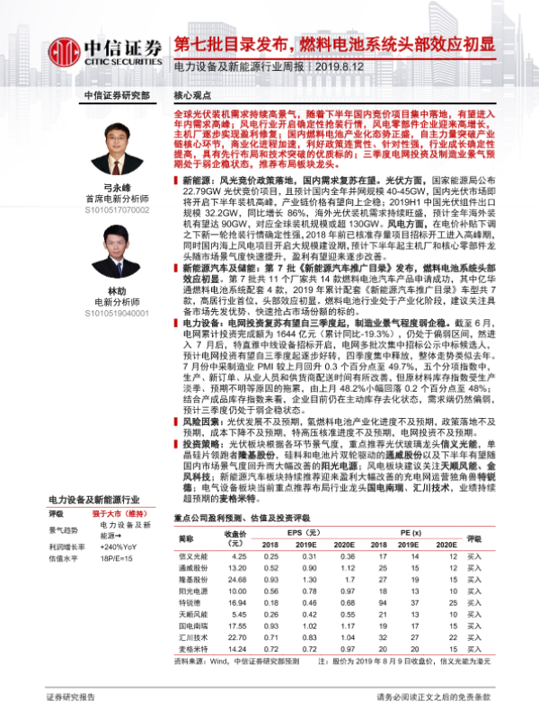 【中信证券】【20190812】电力设备及新能源行业周报:第七批目录发布,燃料电池系统头部效应初显-15页