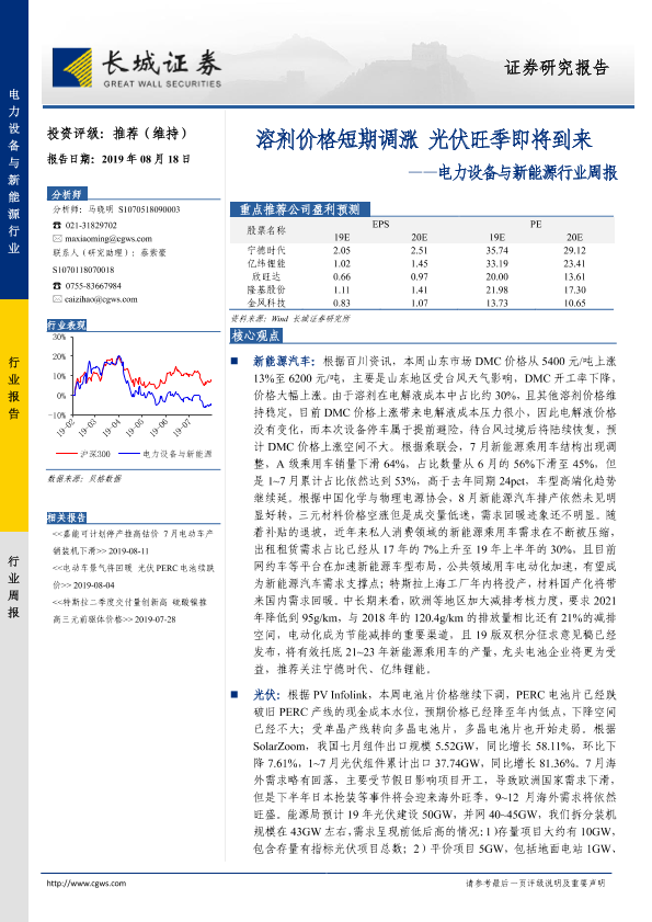 【长城证券】【20190818】电力设备与新能源行业周报:溶剂价格短期调涨 光伏旺季即将到来-15页