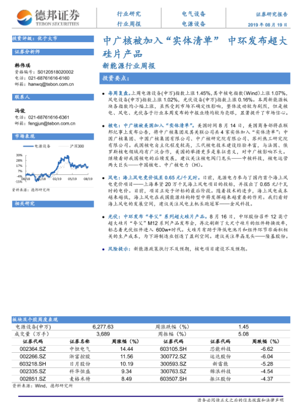 【德邦证券】【20190819】20190819-德邦证券-新能源行业周报:中广核被加入“实体清单”中环发布超大硅片产品-10页