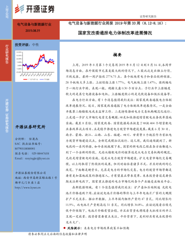 【开源证券】【20190819】电气设备与新能源行业周报2019年第33周:国家发改委通报电力体制改革进展情况-12页