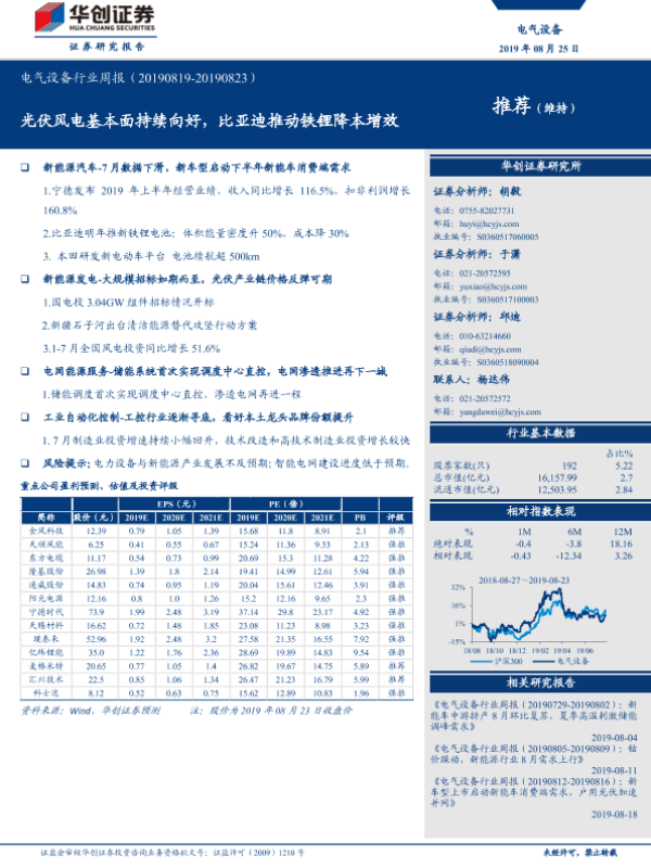 【华创证券】【20190825】电气设备行业周报:光伏风电基本面持续向好,比亚迪推动铁锂降本增效-27页