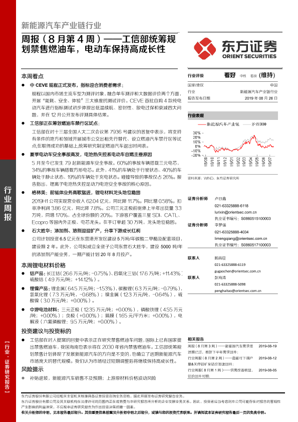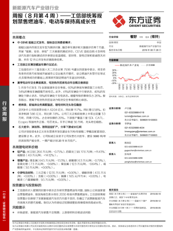 【东方证券】【20190826】新能源汽车产业链行业周报(8月第4周):工信部统筹规划禁售燃油车,电动车保持高成长性-23页