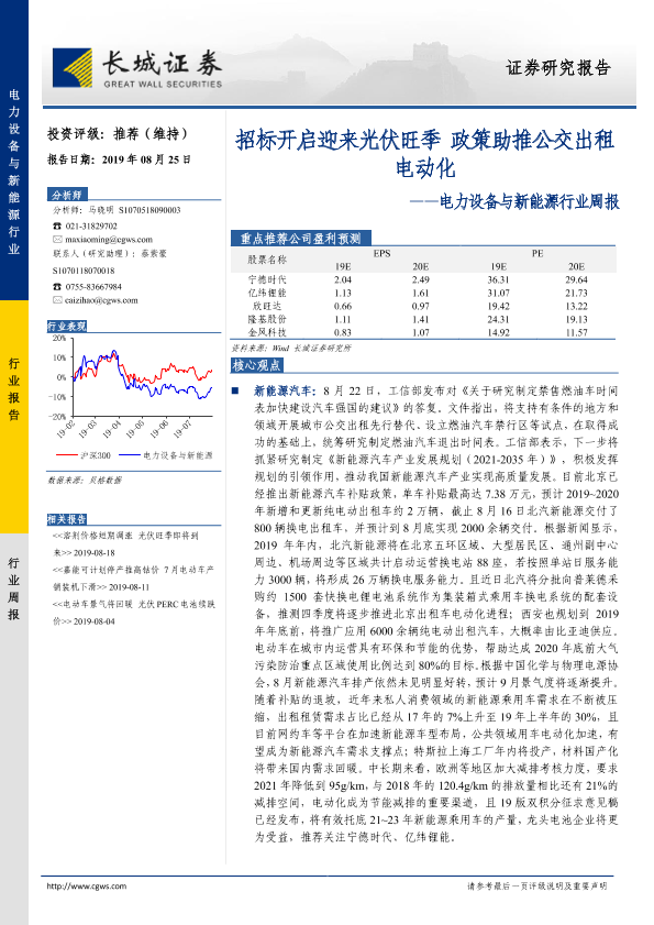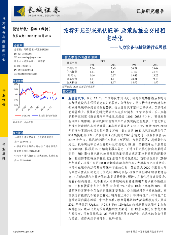 【长城证券】【20190825】电力设备与新能源行业周报:招标开启迎来光伏旺季 政策助推公交出租电动化-17页