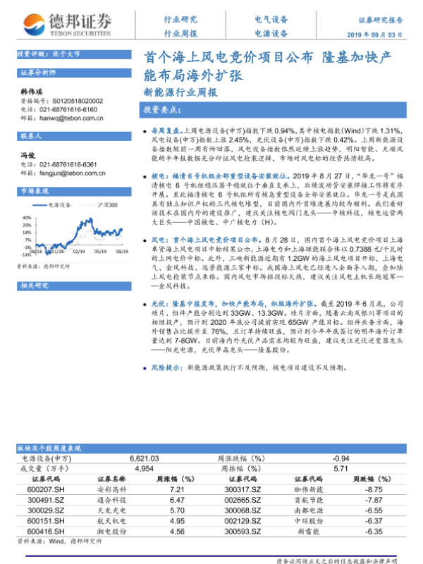 【德邦证券】【20190903】20190903-德邦证券-新能源行业周报:首个海上风电竞价项目公布 隆基加快产能布局海外扩张-10页