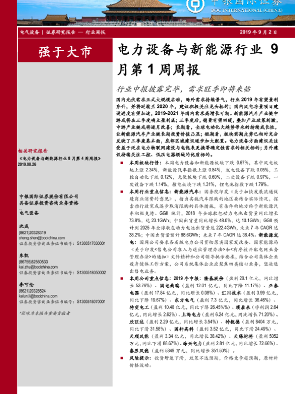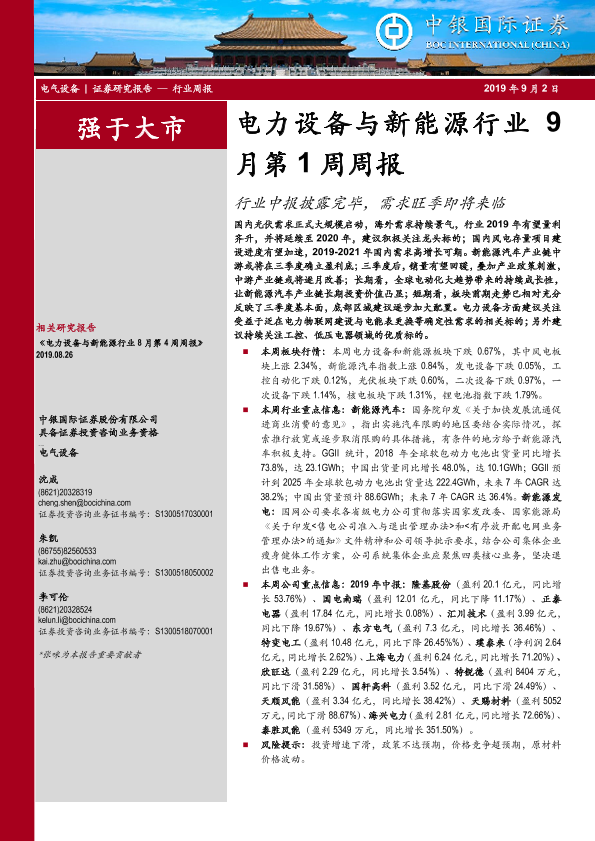 【中银证券】【20190902】电力设备与新能源行业9月第1周周报:行业中报披露完毕,需求旺季即将来临-19页