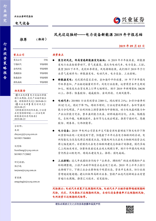 【兴业证券】【20190903】风光这边独好——电力设备新能源 2019年中报总结-51页