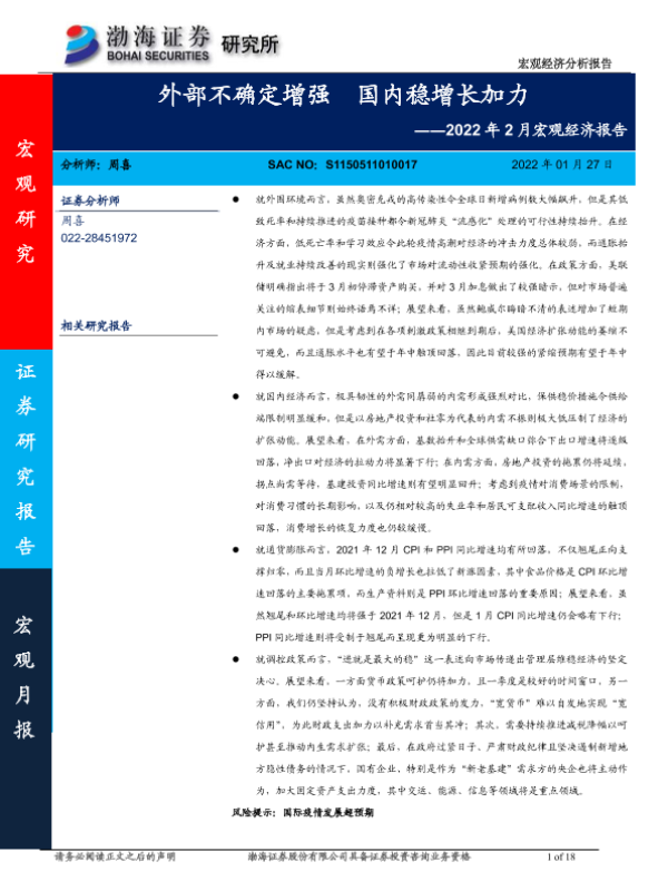 【渤海证券】【20220127】2022年2月宏观经济报告:外部不确定增强,国内稳增长加力-18页