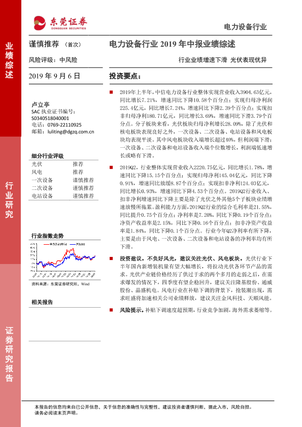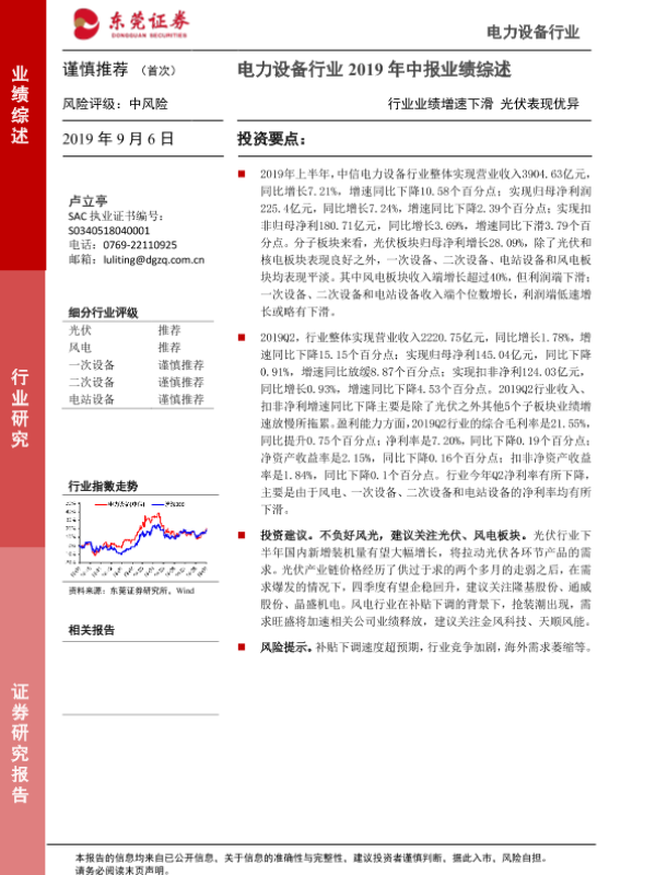 【东莞证券】【20190906】电力设备行业2019年中报业绩综述:行业业绩增速下滑 光伏表现优异-18页