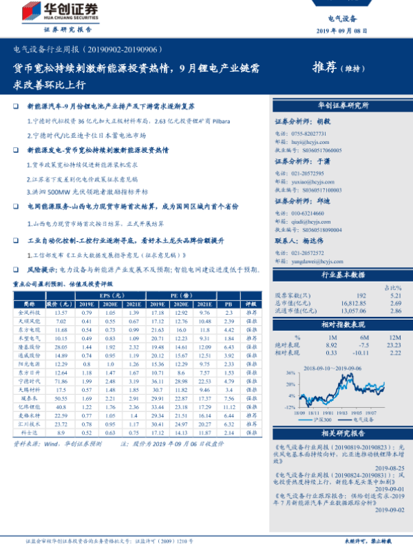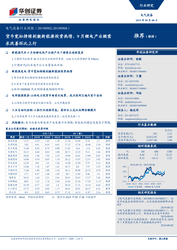 【华创证券】【20190908】电气设备行业周报:货币宽松持续刺激新能源投资热情,9月锂电产业链求改善环比上行-26页