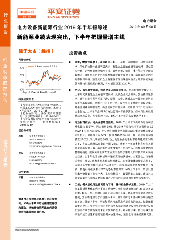 【平安证券】【20190909】电力设备新能源行业2019年半年报综述:新能源业绩表现突出,下半年把握量增主线-24页
