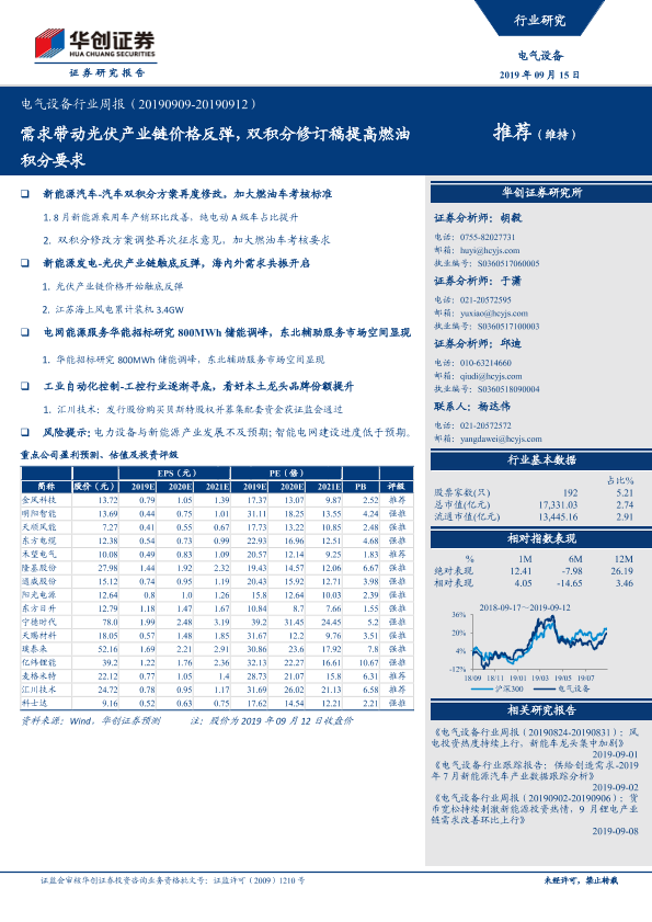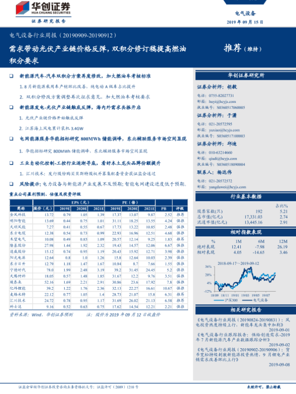 【华创证券】【20190915】电气设备行业周报:需求带动光伏产业链价格反弹,双积分修订稿提高燃油积分要求-23页