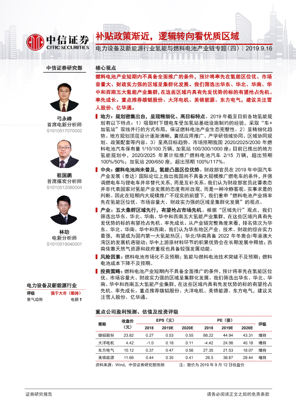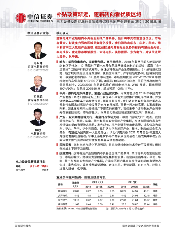 【中信证券】【20190916】电力设备及新能源行业氢能与燃料电池产业链专题(四):补贴政策渐近,逻辑转向看优质区域-10页