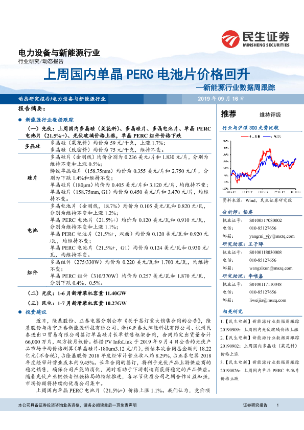 【民生证券】【20190916】20190916-民生证券-新能源行业数据周跟踪:上周国内单晶PERC电池片价格回升-10页