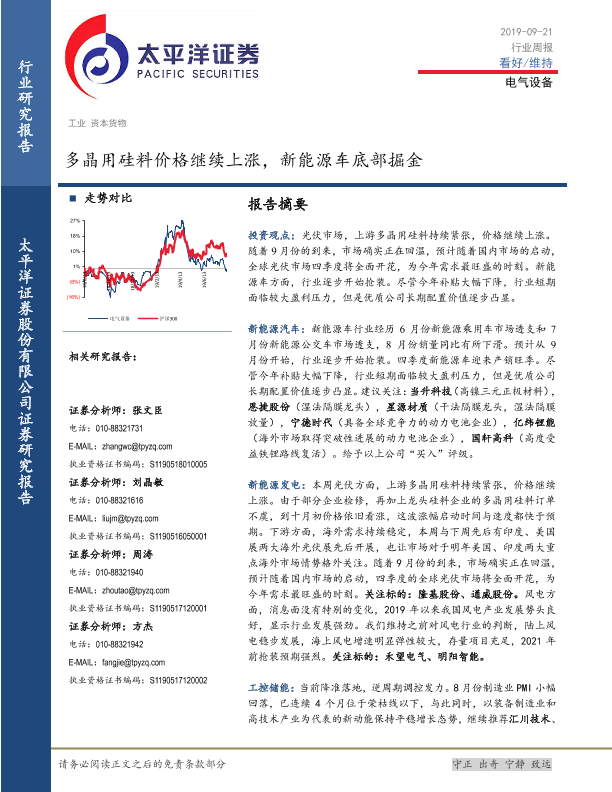 【太平洋证券】【20190921】20190921-太平洋-电气设备行业周报:多晶用硅料价格继续上涨,新能源车底部掘金-18页