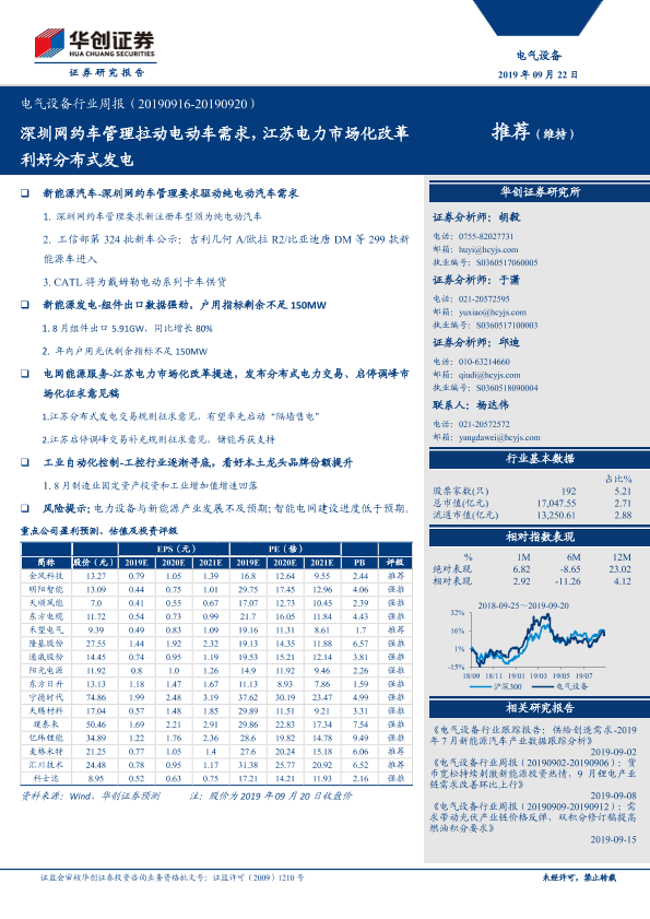 【华创证券】【20190922】电气设备行业周报:深圳网约车管理拉动电动车需求,江苏电力市场化改革利好分布式发电-28页
