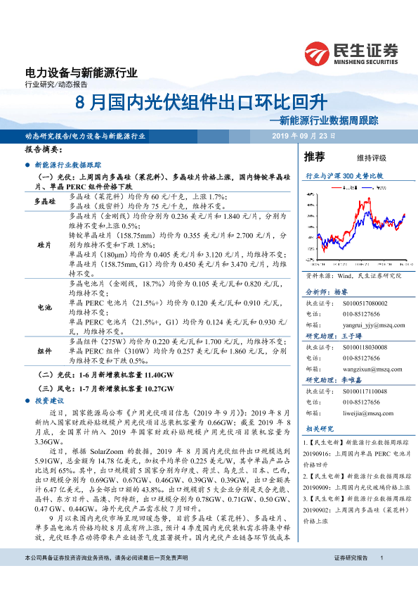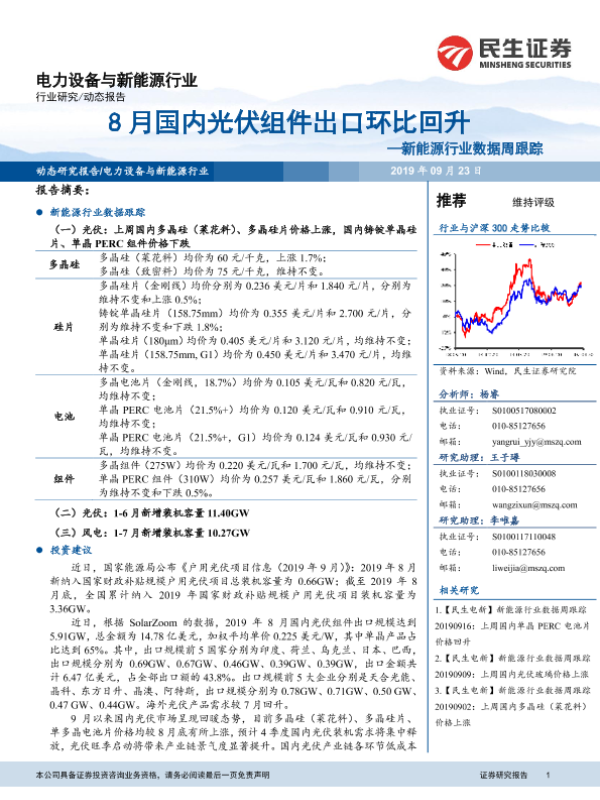 【民生证券】【20190923】20190923-民生证券-新能源行业数据周跟踪:8月国内光伏组件出口环比回升-10页