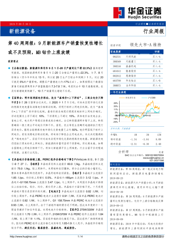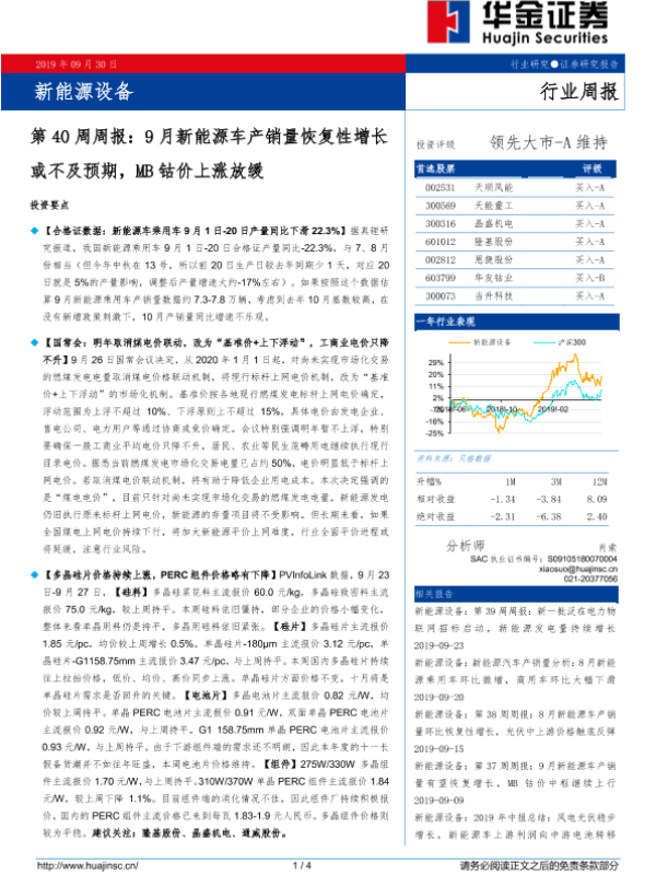 【华金证券】【20190930】20190930-华金证券-新能源设备第40周周报:9月新能源车产销量恢复性增长或不及预期,MB钴价上涨放缓-4页