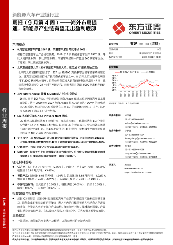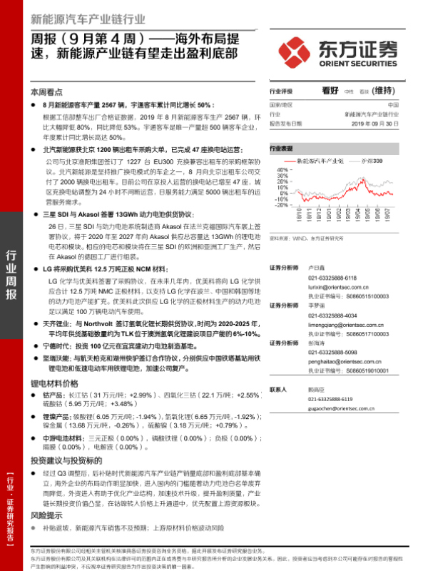 【东方证券】【20190930】新能源汽车产业链行业周报(9月第4周):海外布局提速,新能源产业链有望走出盈利底部-24页
