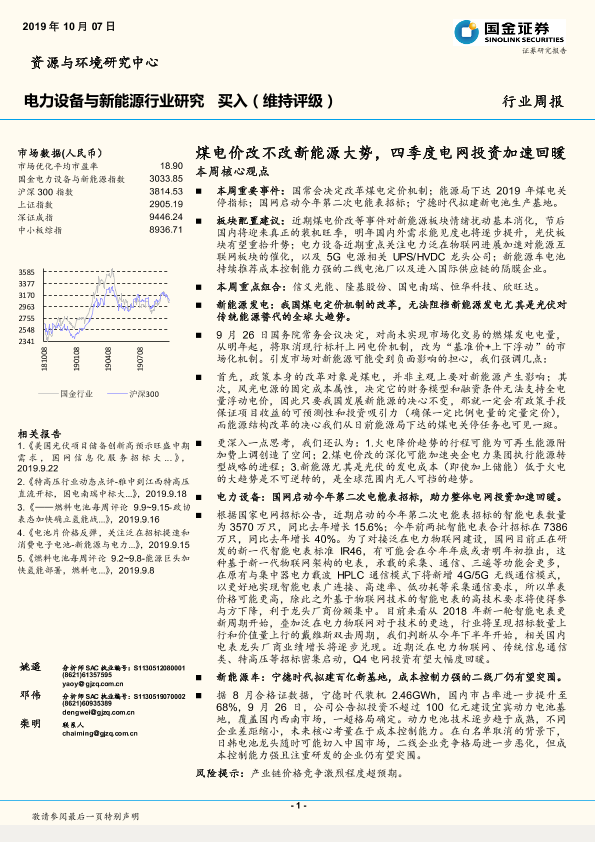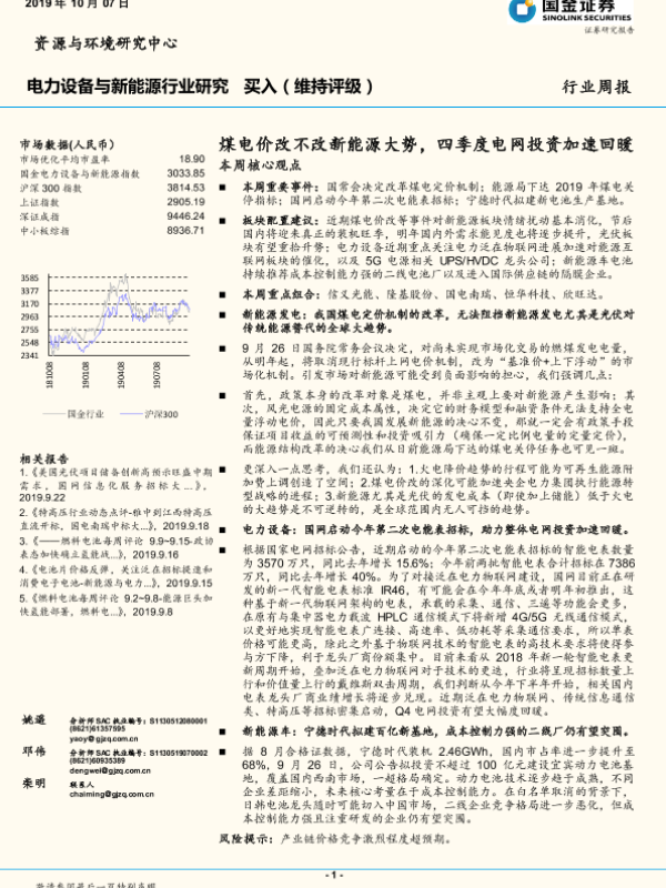 【国金证券】【20191007】电力设备与新能源行业周报:煤电价改不改新能源大势,四季度电网投资加速回暖-4页