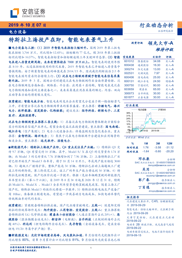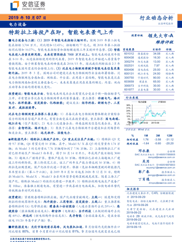 【安信证券】【20191007】电力设备行业动态分析:特斯拉上海投产在即,智能电表景气上升-17页