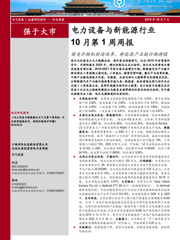 【中银证券】【20191007】电力设备与新能源行业10月第1周周报:煤电价格机制迎改革,新能源产业链价格持稳-18页