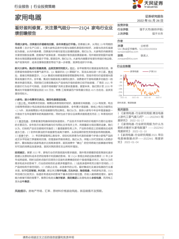 【天风证券】【20220126】21Q4家电行业业绩前瞻报告:看好盈利修复,关注景气细分-24页